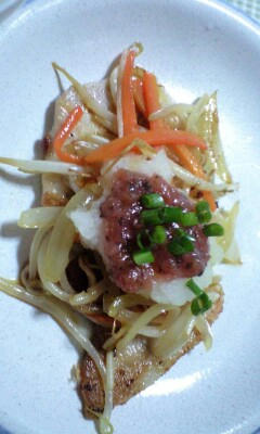 の蓋を被せて蒸し焼きにbb焼き上がった豚肉の上に、炒めた野菜、大根おろし、梅肉ソースをかけてから少々のポン酢をかける。