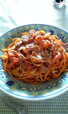 昼飯に作った「ヒラタケとベーコンのトマトスパゲティ」。